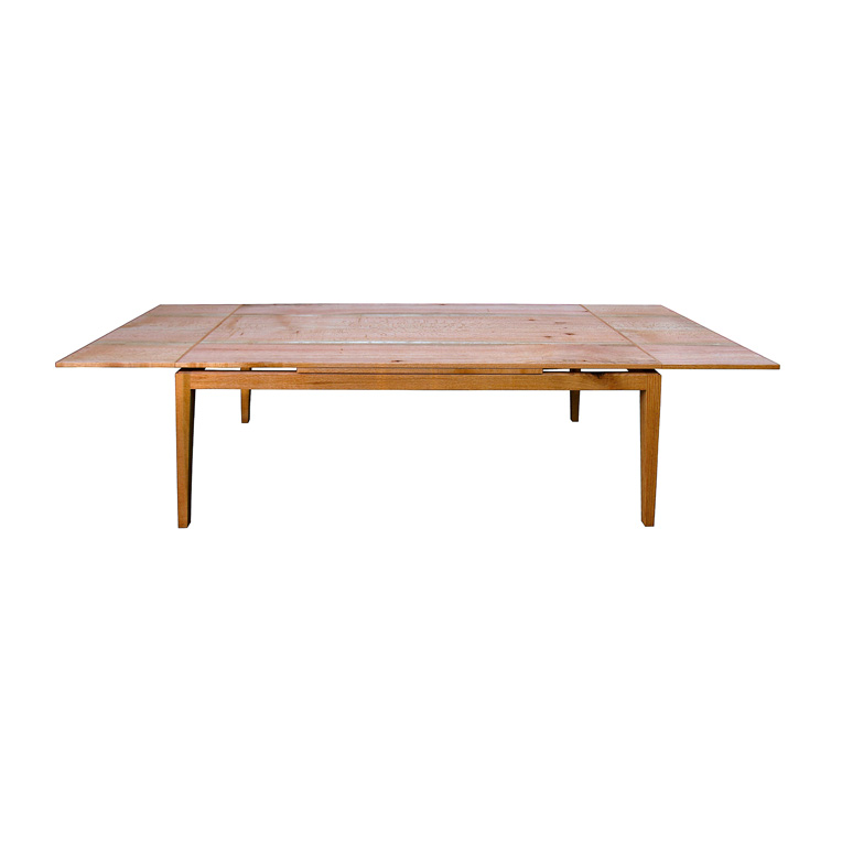 This draw leaf table has a leaf that is pulled out from each end to extend the table from an 8 seater to a 12 seater. It's made form Pin Oak, supplied by the client from a tree that grew out the front of their family home.